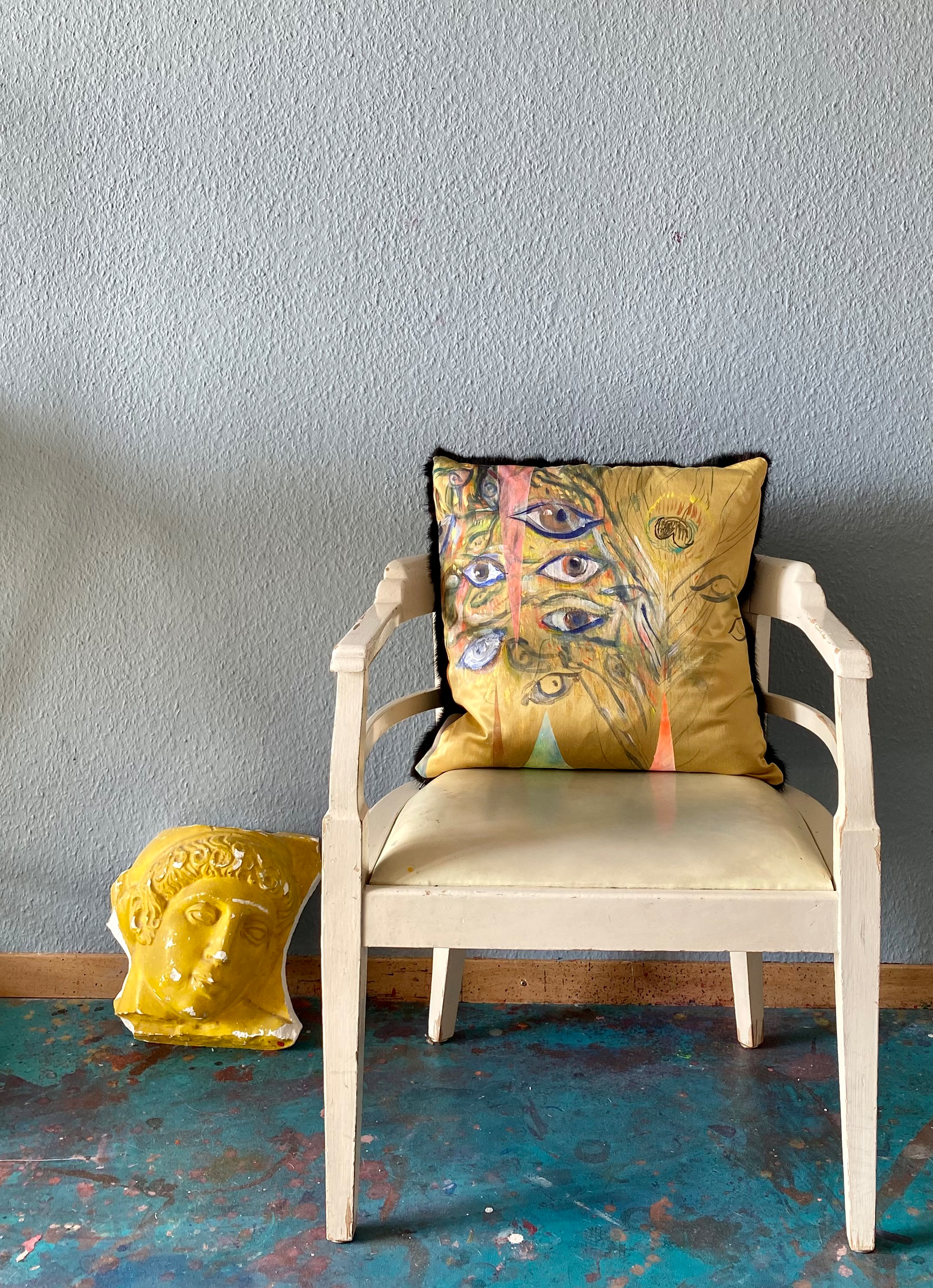 The Yet pillow by Maison Perruche is a unique hand painted creation by the artist Céline Peruzzo. 45 x 45 x 10cmPrice: 250.- Chfr